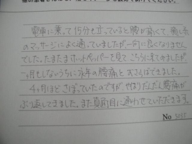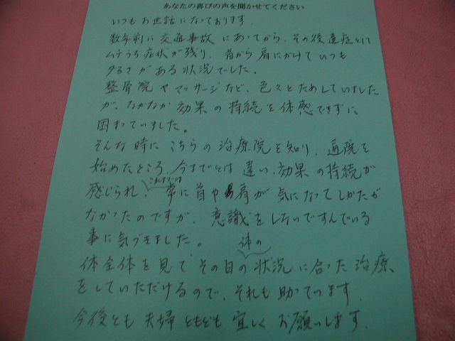 当院に来院されている患者さんの声をお聞きください。 感想を転写中です